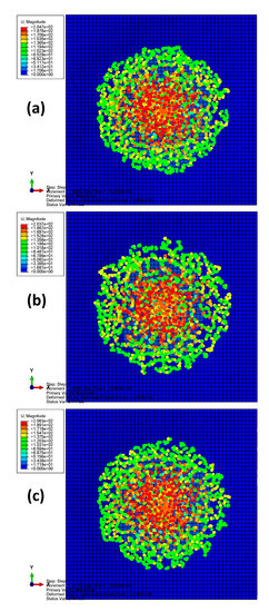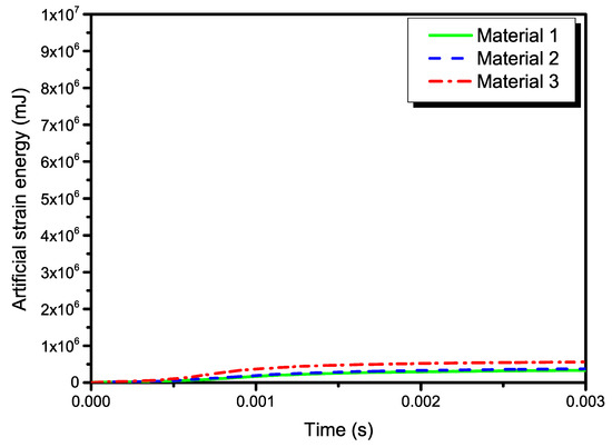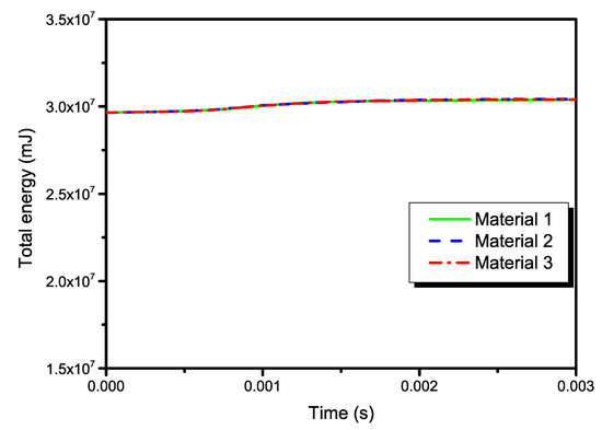 Energy output is particularly important in checking the accuracy of the solution in an explicit dynamic analysis. In order to further validate the global quality of the numerical simulations, the artificial strain energies of the three models are plotted in Figure 17, which belongs to a kind of “artificial” energy and should be negligible compared to “real” energies such as the strain energy and the kinetic energy in explicit dynamic analysis. Theoretically speaking, the total energy in explicit dynamic analysis should be a constant, i.e., the total energy balance. In numerical computation, it can usually be approximate to a constant, as long as the error is small enough. The results in Figure 18 indicate that the total energies of present simulations are close to a constant. From Figure 14, Figure 15, Figure 16, Figure 17 and Figure 18, the effectiveness of present numerical simulations can also be verified.