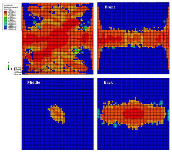 The envelope quantity was used to compare the impact damages of the different material systems, i.e., the envelope damage of the 24 plies in total. Figure 8 depicts the fiber tension damages (the term DAMAGEFT reported in the legend) of the three models after bird impact. The colors from blue to red indicate the damage states ranging from the undamaged to the maximum damaged. If the damage index of an element equals 1, this element has completely lost its load-carrying capacity. The damaged area of the laminate with material 3 is the largest (≈100%), while that of material 2 is the smallest (≈80%). The reason can be ascribed to the different properties of the fiber tension strength XT, for which material 2 is the best and material 3 is the worst. Therefore, the fiber tension damage is mainly governed by the fiber tension strength, while the longitudinal tensile fracture energy has little effect on it because of material 3 is approximately 23 times higher than that of materials 1 and 2. Figure 9 depicts the fiber tension damages at different plies (front, middle, and back plies) of the plate with material 2. Results show that both the center of the back side and the boundary of the front side experience relatively high fiber-tension damage, while the middle ply experiences relatively small damage. These distribution laws agree well with the experimental observations from the previous literature dealing with the other composite material systems under high-velocity impact [16,22,40].