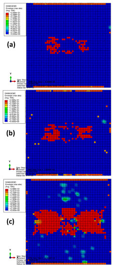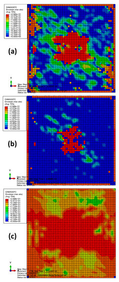 The matrix compression damages of the three models after bird impact: (a) material 1; (b) material 2; (c) material 3.