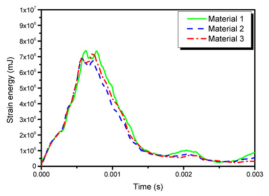 Figure 14, Figure 15 and Figure 16 show the time histories of kinetic energies, strain energies, and damage dissipation energies in the three models, respectively. The time histories of kinetic energies and strain energies in the three models are close to each other, which also indicates that the global deformations are similar in different materials. However, the damage dissipation energies are quite different in the three models, with material 2 the lowest and material 3 the highest. A preliminary explanation is that material 2 is characterized by high stiffness and high strength. On the contrary, it can be noted that material 3 is characterized by the lowest strength parameters.