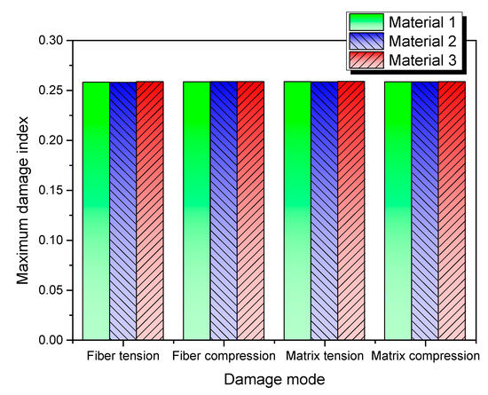 - The three composite materials have similar distribution patterns in the matrix compression damage, while the most severe matrix compression damage appeared in material 3, due to its weakest shear strengths;