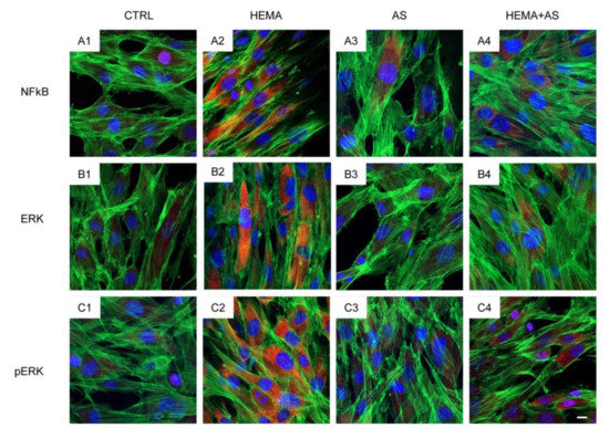 Immunofluorescence experiments to reveal NFkB, ERK and pERK localization were performed in hDPSCs tested in the above mentioned conditions. Pictures in Figure 4 show an increased fluorescence signal derived from NFkB-, ERK- and pERK-immunostaining in HEMA-treated hDPSCs (Figure 4A2,B2,C2), when compared to the hDPSCs in the other experimental conditions, in particular to the cells treated with HEMA + AS. As evidenced in the figure, the cells treated with HEMA exhibited a significant increase of NFkB-, ERK- and pERK expression as evidenced from red fluorescence signal (Figure 4A4,B4,C4).