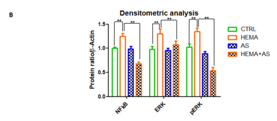 Protein expression. (A) Western blotting assay of NFkB, ERK, pERK expression in hDPSCs cells treated with 2 mM of HEMA alone or in presence of AS. Each membrane has been probed with β–actin antibody as housekeeping protein. Western blot is representative of three different analyses. (B) Densitometric analysis of proteins bands expressed as ratio of protein quantification normalized with β–actin (mean of three separate experiments). The error bars on these graphs evidence standard deviation (± SD). Graph bars showed the densitometric analysis. ** HEMA + AS versus HEMA: p < 0.01; ** AS versus CTRL: p < 0.01.