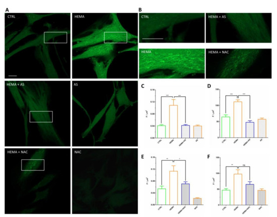 To assess the ROS production induced by HEMA, hDPSCs were loaded with the cell-permeant H2DCFDA probe, a chemically reduced form of fluorescein utilized as an indicator for ROS. Confocal microscopy images were acquired on randomly selected fields and the fluorescence recorded was off-line analyzed. In Figure 6A are reported representative images acquired during different experimental conditions. The images revealed a higher fluorescence level in HEMA-treated cells in comparison to all the other experimental conditions (CTRL, AS, HEMA + AS). In addition, while the CTRL sample showed a flat and homogenously distributed fluorescence intensity signal, the HEMA-treated cells showed spaghetti-like area, resembling mitochondria morphology. Interestingly, these peculiar areas in HEMA-treated cells showed higher fluorescence signals than those observed in the other experimental conditions. Quantitative results reported in Figure 6C, derived from off-line analysis of the whole individual cell soma, showed an increase in ROS production in HEMA-treated hDPSCs vs CTRL (means ± S.E.M.: HEMA 0.110 ± 0.012 vs CTRL 0.041 ± 0.003). The co-presence of HEMA and AS appeared to effectively block the ROS increase induced by HEMA (HEMA + AS 0.042 ± 0.003). The AS alone did not modify the ROS basal levels acquired in CTRL samples (AS 0.040 ± 0.003). The quantification performed in the assumed mitochondrial areas (Figure 6D), showed a similar trend among the treatments (HEMA 111.40 ± 6.15 vs CTRL 64.32 ± 6.51; HEMA + AS 47.72 ± 5.00; AS 57.12 ± 4.00). The results from this set of experiments indicate that HEMA treatment showed statistically significant (p < 0.0001) higher ROS levels compared with no treated hDPSCs (CTRL), and AS was able to prevent the HEMA-induced ROS production. The AS anti-oxidant ability was compared to that expressed by NAC, a known antioxidant molecule (Figure 6A,B,E). Comparing the images from HEMA + AS treatment vs HEMA + NAC treatment it is possible to detect a decreased cytosolic fluorescence signal in both treatments respect to HEMA-treatment, while in images from HEMA + NAC treatment a detectable mitochondrial fluorescence signal still persists (Figure 6B). In our experimental conditions also 1mM NAC is able to prevent HEMA-induced ROS production (HEMA 0.113 ± 0.018 vs HEMA + NAC 0.070 ± 0.007). However, the data derived from the analysis of the mitochondrial areas (Figure 6F) showed that NAC in this district is not able to completely turn off the production of ROS. Indeed, even if NAC-treatment reduced the fluorescence signal, there is no significant difference between the HEMA and HEMA + NAC samples (97.80 ± 13.48 vs. 65.25 ± 8.28).
