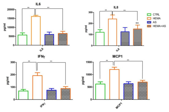 Differential cytokines release after 24 h of incubation in media from hDPSCs CTRL or HEMA-, AS- and HEMA + AS-treated cells. Data shown are the mean ± SD of three different experiments. ** HEMA + AS versus HEMA: p < 0.01; ** AS versus CTRL: p < 0.01.