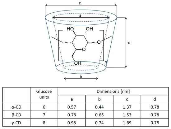 Cyclodextrins represent a family of macrocyclic oligosaccharides. Generally, cyclodextrins consist of six, seven, or eight glucose units that are linked by α-1-4-glucosidic bonds and they are called α-, β-, or γ-cyclodextrin, respectively [15]. The cyclodextrin (CD) molecule has the shape of a toroid (Figure 1) with a hydrophobic cavity and a hydrophilic outer surface. This is the result of the orientation of the hydroxyl groups in the molecule: the primary hydroxyl groups are in the narrower part, while secondary ones are located in the wider part of the molecule. The cyclodextrin cave is hydrophobic because of the presence of ether-like 1,4-glycosidic linkages [16,17,18]. This structure gives CD one of its most interesting features, namely, the ability to host hydrophobic molecules, which can be incorporated into the hydrophobic cavity [19,20,21]. In an aqueous solution, the outer part of the molecule facilitates interactions with the solvent, while the inner hydrophobic part of the CD molecule favors the formation of an inclusion complex with a hydrophobic “guest” molecule due to solvophobic interactions, such as hydrogen bonding and van der Waals electrostatic interactions [22,23,24,25,26]. The resulting host–guest complex in an aqueous solution is relatively stable. The association constant (Ka) is defined as: