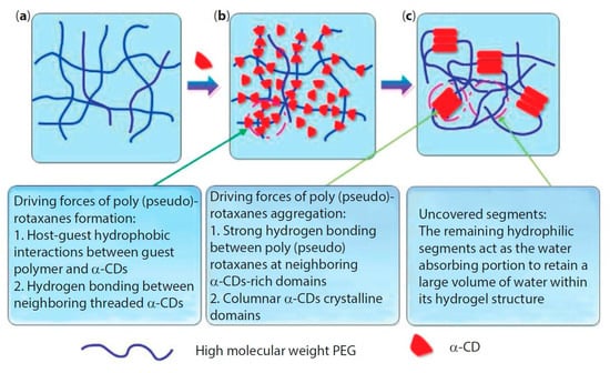 The formation of supramolecular PPR hydrogel that is based on α-CD/polymeric chain occurs in two main stages: (i) first, host–guest interactions allow for the polymeric chain to penetrate into the CD cavity with the formation of polypseudorotaxane; (ii) next, hydrogen bonding occurs between neighboring α-cyclodextrin molecules, and these CDs aggregate into crystalline complexes, which act as knots of the physically crosslinked polymer network (Figure 2). However, crystalline complexes rarely form without the appearance of hydrogen bonds between CDs of various PPRs, because of the formation of one-dimensional aggregates of CDs threaded on the polymer chain [49].