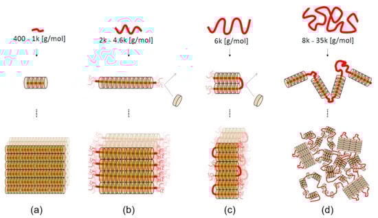 The self-assembly behavior of the forming polypseudorotaxanes depends on the length of the PEG chains (Figure 3). For PEG with a relatively small molar mass (400–1000 g/mol), cyclodextrins cover the entire chains, and crystalline domains grow without limitation (Figure 3a) [52]. The ends of PEG chains are not fully threaded by α-CDs when the molar mass of PEG is between 2 and 4.6 kg/mol. Thus, the formation of isolated crystalline domains occurs (Figure 3b). For PEGs with a molar mass of 6 kg/mol, the chains fold into the most favorable conformation, and threaded α-CDs form crystalline domains with uncovered folded PEG chains (Figure 3c). The chains of PEG with a relatively high molar mass (8–35 kg/mol) are folded in many places, and crystalline clusters of α-CD are formed with long uncovered chains (Figure 3d). It should be noted that a small amount of unthreaded α-CD is present in such systems due to the faster kinetics of forming the crystalline domain (gelation) toward the slower threading of the polymer chains [39,53]. The presence of unthreaded PEG chain fragments is necessary for supramolecular hydrogel formation. Hydrophilic PEG chains allow for water to be retained in the structure of the resulting supramolecular polypseudorotaxane hydrogel. Hydrogels cannot be formed without the inclusion of water, because the highly hydrophobic crystalline domains would precipitate in an aqueous solution. The lowest molar mass of PEG that enables α-CD/PEG-based hydrogel formation has been reported to be 2 kg/mol [39].