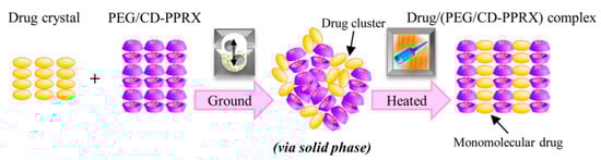- Ogawa, M.; Higashi, K.; Namiki, S.; Liu, N.; Ueda, K.; Limwikrant, W.; Yamamoto, K.; Moribe, K. Solid-Phase Mediated Methodology to Incorporate Drug into Intermolecular Spaces of Cyclodextrin Columns in Polyethylene Glycol/Cyclodextrin-Polypseudorotaxanes by Cogrinding and Subsequent Heating. Cryst. Growth Des. 2017, 17, 1055–1068. [Google Scholar] [CrossRef]