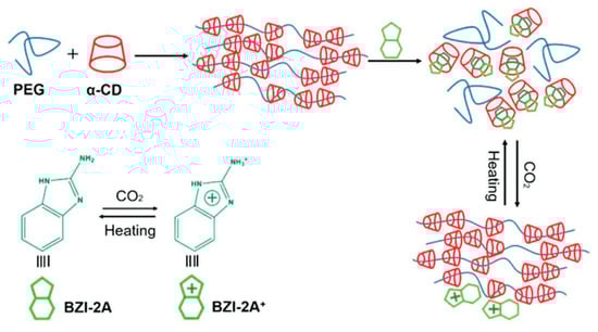 Preparation of the responsive polypseudorotaxane hydrogels triggered by CO2. Adapted with permission from Macromol. Chem. Phys. 2019, 220, 1900071 [112]. Copyright (2019) WILEY-VCH Verlag GmbH & Co. KGaA, Weinheim.