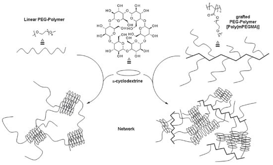 Schematic structure of PPR hydrogels made from linear (left) and PEG-grafted copolymer (right) with α-cyclodextrin. Adapted with permission from Macromol. Chem. Phys. 2019, 220, 1900081 [132]. Copyright (2019) WILEY-VCH Verlag GmbH & Co. KGaA, Weinheim.