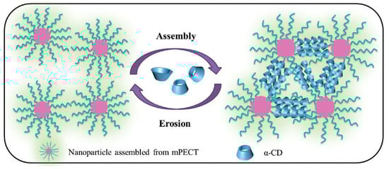 Illustration of the formation and structure of a polypseudorotaxane hydrogel composed of nanoparticles and α-CD. Adapted with permission from Macromol. Biosci. 2016, 16, 1188−1199 [154]. Copyright (2016) WILEY-VCH Verlag GmbH & Co. KGaA, Weinheim.
