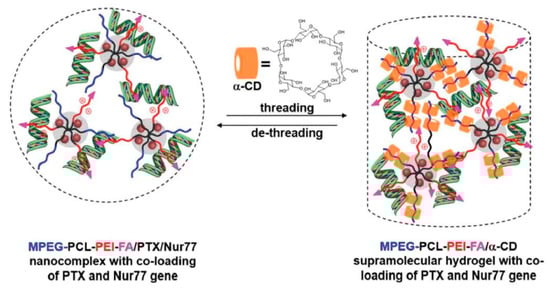 Illustration of the formation of the MPEG-PCL-PEI-FA/α-CD supramolecular hydrogel with co-loading of PTX and the Nur77 gene, which could also be reversed by the de-threading of α-CD in a biological environment, leading to the sustained released of the drug and gene. Adapted with permission from Macromol. Rapid Commun. 2019, 40, 1800117 [170]. Copyright (2018) WILEY-VCH Verlag GmbH & Co. KGaA, Weinheim.