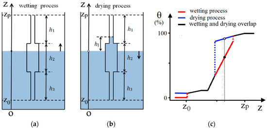 The level of the liquid in the exterior is the independent variable (z) and the percentage of the volume of the pore filled with the liquid. The drying process is started when the liquid in the exterior is at the level z = zp and the pore is filled 100%. After the entire pore is emptied (z = z0 corresponding to 0%) and the level of the liquid increases, then the wetting process occurs. In fact, in field it is very difficult to remove all water from the soil as this can be done only in the laboratory. In Figure 2c, we show the dependence of the filling percentage of the pores (named usually θ) as a function of z on both drying and wetting processes which show a hysteretic behavior. From the theoretical point of view, it is important to say that the shape of this hysteresis loop can be controlled by the geometrical parameters characterizing the pore. Additionally, an important fact that we have to mention is that the hysteresis loop is far from having a rectangular shape, as it is required in the Classical Preisach Model (CPM). Essentially, this means that we have to add to the model a reversible component, which can account for the variations in the measured filling degree which are not due to irreversible processes. A simple analysis for the pore shape we have considered shows that the reversible component is dependent on the radii of the cylinders in the three distinct regions.