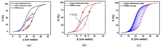 Simulation of the minor hysteresis loops when a small variation in the quantity of water occurs at one point on major hysteresis loop or First-Order Reversal Curve (FORC) (a); water content from soil when the water level reached height z on FORC curve after the pore was filled with water up to the reversal point (b); and a set of FORC curves (c) simulating the drying curves starting from different points of wetting branch till the empty state.
