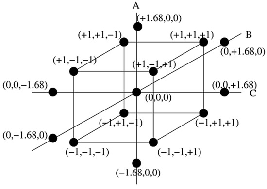A Central Composite Design (CCD) is a set of experimental designs with three different design points i.e., factorial points (±1), a centre point (0) and star/axial points (±α). For a three factors CCD, the value of α is 1.68. The general form of a CCD with three input variables/factors (A, B, C) and their coded values (±1), centre point (0) and axial/star points (±α) is illustrated in Figure 1. The CCD is a valuable asset in determining the response surfaces by fitting a quadratic model in order to estimate the effect of curvature, or to find out the maxima or minima of a variable. Table 1 illustrates the input variables (factors) and the factors level setting in their coded form based on CCD.