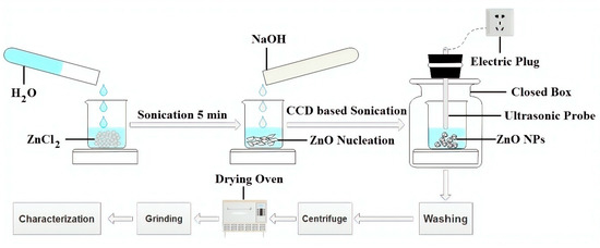 In one pot synthesis of zinc oxide nanoparticles (ZnO NPs), varying amounts of ZnCl2 (1.5 g to 18.5 g) were added into a beaker and then we adjusted the amount of water so that the total volume of the solution was maintained at 100 mL. During all experiments, distilled water was utilised. Sonicate the solution for 5 min to make a homogenous solution. A varied amount of NaOH granules (3.3 g to 11.7 g) was added into the running solution. To complete the reaction mechanism, the solution was then sonicated for different time intervals (19.7 min to 70.2 min) based on CCD under ultrasonic probe homogeniser (Bandelin Sonopuls HD 3200, Bandelin Electronic GmbH & Co. KG, Berlin, Germany, 20 kHZ, 200 W, 50% efficiency). The effective power of ultrasonic waves emitted into the solution was 100 Wcm−2, which value was experimentally determined by calorimetric measurement. After the completion of the sonication process, the resulting white flocculates were washed five times with ethanol to remove the excess amount of trashes and impurities. Afterwards, the white flocculates were centrifuged at 4000 rpm for 15 min to separate solid particles from liquid. The centrifuged solid was dried at 80 °C for 1 h in an oven to remove the remaining percentage of moisture and organic impurities. The centrifuged solid was then grinded to obtain the fine powder of ZnO that further characterised it. During our experiments, we observed that Sample 3 provided the maximum MB removal (%). So, in order to compare and to investigate the essential impact of the ultrasonic method, a similar sample was synthesised by the conventional magnetic stirring method under same experimental conditions without sonication, and named as sample M, as provided in Table 2. The schematic illustration of the experimental setup is given in Figure 2.