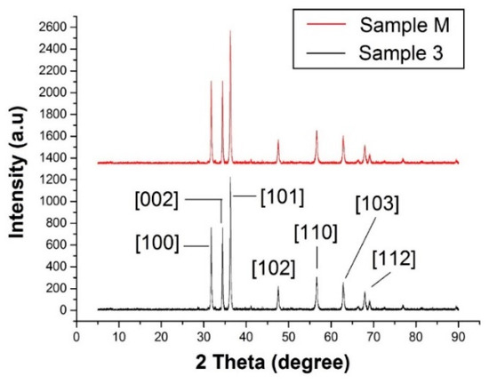XRD analysis is a valuable asset in order to determine the crystal structure and crystallite size of a samples. The XRD patterns for observed samples (Sample 3 and Sample M) showed that the synthesised ZnO NPs possessed a pure hexagonal wurtzite crystal structure, as all the obtained peaks under XRD analysis for both methods (sonochemical and conventional stirring) matched with the ICDD file (PDF: 89-7102). In Figure 4, the highest peak obtained at 2θ = 36.2° is the characteristic crystalline peak of hexagonal wurtzite crystals of pure ZnO that follows [101] plane reflection. Moreover, a series of crystalline peaks at 2θ = 31.7°, 34.4°, 47.5°, 56.6°, 62.8° and 67.9° follow the [100], [002], [102], [110], [103] and [112] planes, respectively. We observed that hexagonal wurtzite crystals of nano ZnO were formed by both methods with a significant difference regarding crystal size for these methods. The average particle size for observed samples calculated by Scherrer’s Equation was 28.1 nm and 70.8 nm for Sample 3 and Sample M, respectively. The average particle size of all the samples prepared by the sonochemical method was 28 nm. The samples prepared by this sonochemical method have three times less particle size than the conventional method, which explains the significant role of the ultrasonic method in the synthesis mechanism of nanomaterials. The XRD results for particle size are in good agreement with the SEM results. Furthermore, no other phase (impurities) i.e., Zn(OH)2, was found during the XRD analysis.