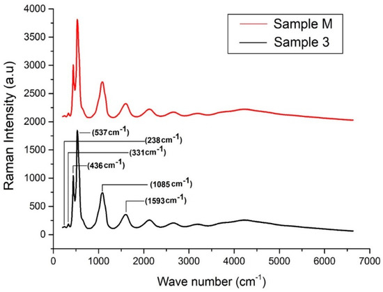 Raman spectrum for Sample 3 developed with optimal conditions ZnCl2 15 g, NaOH 10 g, Sonication time 60 min, and Sample M developed without sonication.