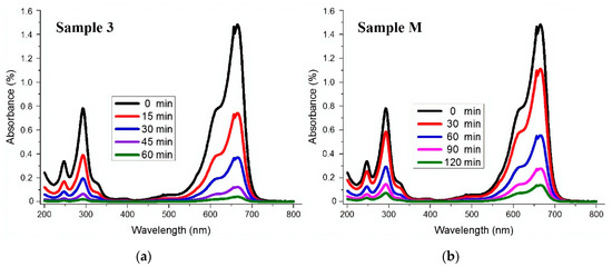 The photocatalytic activity of as synthesised ZnO NPs was evaluated against MB dye solution. 0.5 g·L−1 of the prepared ZnO NPs was used for 50 mg·L−1 of MB dye. It was observed that under UV light irradiations, samples prepared by the ultrasonic method completely degraded MB dye in less than 60 min, while for Sample M, the degradation took a longer time. The results are quite obvious, as we obtained a smaller particle size by the sonochemical method than any conventional method. The results of MB degradation are in good agreement with BET results. The results of MB degradation for Sample 3 and Sample M are illustrated in Figure 6. In order to confirm that MB degradation was only due to ZnO NPs, a controlled sample of MB dye (without ZnO NPs) was exposed to UV light. This sample did not change its colour even after a longer time. This confirmed that MB degradation was only due to the presence of ZnO NPs in the dye solution. The overall results explain that sonochemically-prepared samples showed higher photocatalytic performance for MB than Sample M. UV-vis spectral changes in the MB dye solution as a function of UV light irradiations’ times are illustrated in Figure 6.