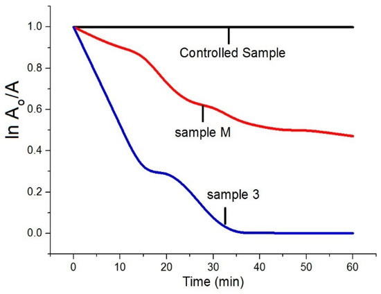 Time-dependent photocatalytic removal of MB. Ao show the absorbance at time t = 0, whereas A represents the absorbance at time t = ∞, respectively.