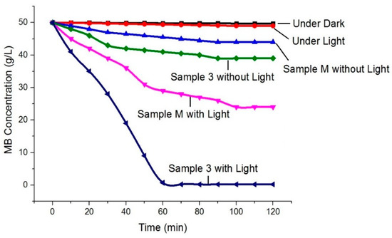 The ln Ao/A plot for the complete degradation of MB against irradiation time is illustrated in Figure 7, where Ao represents the absorbance at time t = 0 min, and A represents the absorbance after a complete MB degradation at time t = ∞ min. The results explained that in a controlled sample (without ZnO NPs), no change was observed in MB degradation even after longer time, while 53% change was observed for Sample M as it is synthesised by a conventional method. However, a complete 99.9% MB degradation was observed in case of Sample 3. Furthermore, in order to investigate the behaviour of MB under different conditions, i.e., in the presence of dark, in the presence of light, in the presence of Sample M (with and without light) and in the presence of Sample 3 (with and without light), had also been evaluated, and the results are illustrated in Figure 8. Under dark conditions without ZnO NPs, the MB colour remained unchanged. Under irradiations (light conditions) without ZnO NPs, we still did not observe any significant change. For Sample M, 7% and 48% degradation of MB dye was observed under dark and light conditions, respectively. 16% colour change was observed for Sample 3 under dark conditions, whereas a significant colour change of 99.9% was observed for Sample 3 during light irradiations that showed the excellent photocatalytic activity of prepared ZnO NPs. It was noted that the colour change of MB under dark conditions for both samples (Sample M and Sample 3) was only because of the extra white colour of the prepared samples, which means that even with the photocatalyst, the process of photocatalysis was not started without light. So, we concluded that for photocatalytic degradation of pollutants, the presence of both, i.e., light and photocatalyst, is necessary. The influence of the ultrasonic method was significantly high, as we observed 99.9% MB degradation for Sample 3.