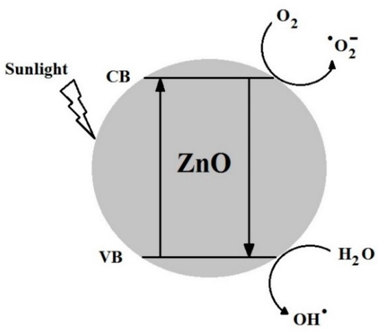 Photocatalysis is a dynamic mechanism and the most fundamental property of nano ZnO that triggers a series of oxidation and reduction reactions. In photocatalysis, nano ZnO absorbs light energy and breaks down the long chain organic molecules (pollutants) into smaller fragments i.e., atoms, ions and radicals. Theoretically, photocatalysis is the conversion of light energy into chemical energy to produce radicals and other unstable chemical compounds. The primary oxidizing species formed during photocatalysis are hydroxyl radicals and superoxide anions [62]. The hexagonal wurtzite crystal form of pure ZnO is significantly used in many industrial and practical applications. Rakhshaei et al. reported that ZnO NPs with hexagonal phase show significant photocatalytic properties [63]. When a photon having energy greater than the band gap energy of ZnO strikes on its surface, electrons are released. The released electron further reacted with atmospheric oxygen to become a super oxide anion (O2−). The surface that has lost an electron takes another electron from moisture to fill up the hole. This converted the moisture into a hydroxyl radical (•OH). The two, i.e., the hydroxyl radical (•OH) and the superoxide anion (O2−) are highly reactive, and due to their strong oxidative power, they decompose organic compounds that cause staining. In our previous investigation, we explained the role of reactive oxygen species (ROS) during photocatalysis and reported that hydroxyl radicals (•OH) are the major radical scavengers that are responsible for the degradation of pollutants [56]. More production of ROS on the surface of the photocatalyst increases their power to degrade pollutants. The general mechanism of photocatalysis on the surface of nano ZnO is illustrated in Figure 9.