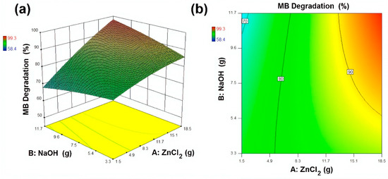 Response surface and contour plot for MB degradation (%) as a function of ZnCl2 and NaOH where (a) Response surface (b) contour plot respectively.