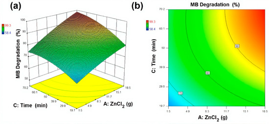 Response surface and contour plot for MB degradation (%) as a function of ZnCl2 and ultrasonic irradiation time where (a) Response surface (b) contour plot respectively.