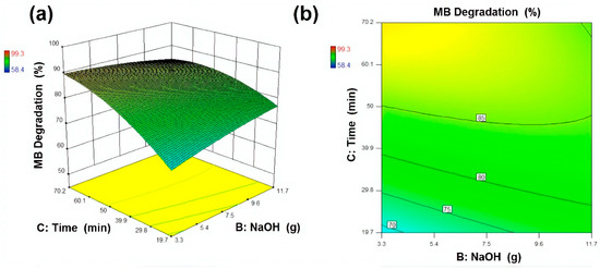 Response surface and contour plot for MB degradation (%) as a function of NaOH and ultrasonic irradiation time where (a) Response surface (b) contour plot respectively.