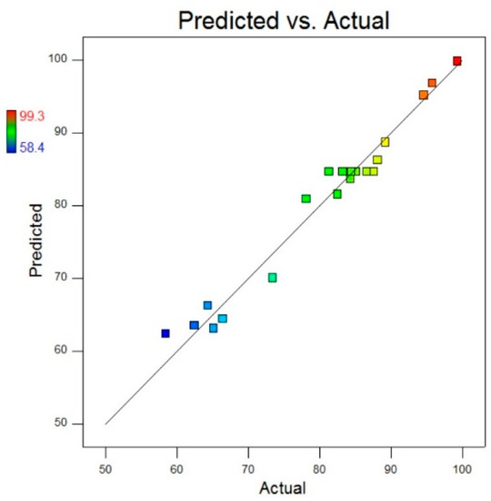 A comparison of actual values and predicted values for MB removal (%) is illustrated in Figure 13 that was used to detect the values that were not detected by the designed model. This comparative plot explains the overall pros of our fitted model in terms of statistical analysis and absolute residual minimisation. It was observed that the experimental values were very close to the normal distribution line, indicating a good fit of the model. The normal probability plot of residuals for raw residuals, internally studentised residuals and externally studentised residuals regarding MB degradation, is illustrated in Figure 14 that explained the relationship of experimental data with the standardised normal distribution, whereas the plot between residuals and experimental run order for raw residuals, internally studentised residuals and externally studentised residuals regarding MB degradation is presented in Figure 15, respectively. These graphs explained the lurking factors that influenced the response during experimentation. The optimal design points on the basis of Table 2 and Equation (4) are 15 g ZnCl2, 10 g NaOH and 60 min sonication time.