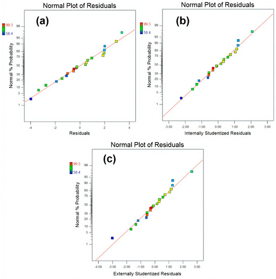 Normal plot of residuals for (a) raw residuals (b) internally studentized residuals and (c) externally studentized residuals respectively.