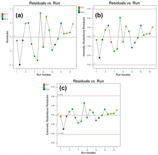 The plots of residuals vs. run for (a) raw residuals (b) internally studentized residuals and (c) externally studentized residuals respectively.