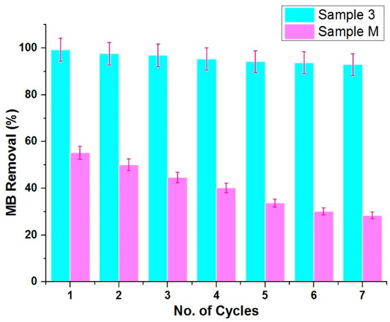 Reusability performance of sonochemical method (Sample 3) vs. conventional method (Sample M) as a photocatalysts against MB removal (%).