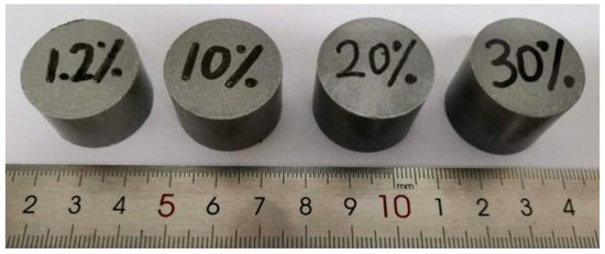 Figure 1 shows PTFE/Al specimens prepared with porosities of 1.2%, 10%, 20%, and 30%, respectively. Table 2 lists the masses before sintering, the masses after sintering, the balance masses before and after sintering, the masses of additives, and the measured porosity of four different PTFE/Al energetic materials.