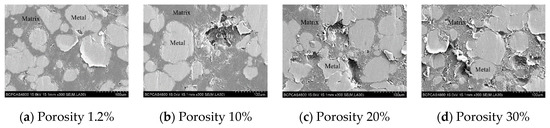 It can be seen from Figure 2 that the Al particles exhibited higher brightness in the backscattered electron imaging, which was due to the higher atomic number of the Al element relative to the C and F elements. In addition, Al particles were distributed discretely in the PTFE matrix. The cavities in the specimens with different porosities were approximately spherical, and the size was basically the same (this is determined by the particle size of the polypropylene added during sintering), and the number of cavities increased significantly with increasing porosity.