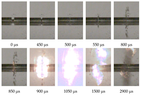 It can be seen from Figure 4 that the specimen was strongly compressed and continuously deformed after the impact, and the strain continued to increase at this time. Assuming that the moment when the incident bar initially struck the specimen was 0, at 450~500 µs the specimen started to fail, and a small amount of debris was spattered out. At 550~800 µs, a large amount of debris was generated probably due to growth and merger of internal cracks [7]. At 800~850 µs, it was seen that the PTFE/Al specimen excitedly reacted and produced a fire. As time went on, the fire gradually strengthened, and then gradually went out. As the interval time from the initial impact of the material sample to the occurrence of flare was the ignition delay time, and the time from the flare generation to the extinction was the reaction duration time, it can be seen that the ignition delay time of the 20% porosity PTFE/Al sample under the loading of 5744 s−1 strain rate was 850 µs, and the reaction duration time was 2050 µs.
