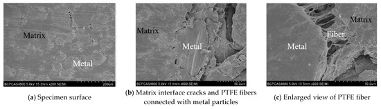 It can be seen from Figure 6a,b that the Al particles deformed a little after dynamic compression, they no longer maintained the spherical shape, and cracks occured at the junction of the metal particles and the matrix. In Figure 6c, which is partially enlarged, it can be seen that the PTFE fibers in the tensile state appeared at the bond between the matrix and the particles, according to [10], these fibers will further prevent the material from further damage.