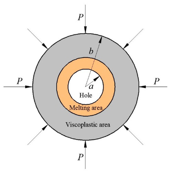 where, , and are the hole radius velocity and acceleration, a0 and b0 are the hole and cell radius at the initial time, and r is the value of the calculated point distance with the center of the sphere as the origin. P is the pressure applied on the outer surface of the cell. Pg is the pressure of the adiabatic compressed gas in the holes, and its change law takes the following form:
