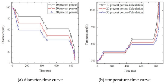 It can be seen from Figure 10b that before 500 µs, the temperature of the specimen with higher porosity rises faster, it is considered that this is mainly because the greater the change in the inner diameter of the pores with higher porosity, and the temperature rise of the material is mainly determined by , the hole radius velocity in the first term on the right side of the polynomial in Equation (6), between 500 and 800 µs, the temperature of the specimen with higher porosity increases slowly. It is considered that this is due to the smaller rate of change in the pores in the specimen with higher porosity during this period, the temperature rise effect of the material is gradually affected by the yield strength Y of the second term on the right side of the polynomial in Equation (6). The quasi-static compression experiment also shows that the specimen with higher porosity has lower yield strength. In addition, the specimens with a porosity of 10% given in Table 3 can react at a strain rate of 5121 s−1 to 5159 s−1, but the specimens with 20% and 30% porosity can react at a strain rate of 5127 s−1 to 5204 s−1, which confirmed the correctness of the theoretical analysis from the side.