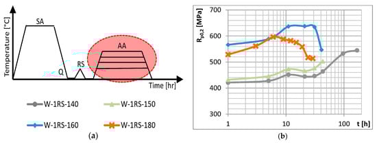 (a) Yield strength vs. time of AA for the condition with no deformation (0RS); (b) Mechanical properties of material of four selected conditions.