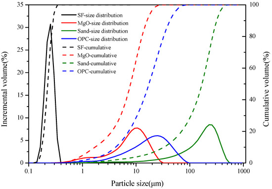 The materials and chemicals used to prepare the cement mixtures were light-burned magnesium oxide (MgO, MagChem 30; MgO activity of 88.40%, M.A.F. Magnesite B.V., City, The Netherlands), silica fume (SF, Elkem Materials Ltd., Shanghai, China), silica sand (Xinlian Quartz Ore, China, >98% SiO2, Xinlian Quartz Sand Mine, Liaoning, China), sodium hexametaphosphate (NaHMP, Sinopharm Group, Shanghai, China), cesium chloride (CsCl, Sinopharm Group, Shanghai, China) and ordinary Portland cement (OPC, P.O 42.5R, Dalian Onoda Cement Co. Ltd., Dalian, China). The characteristics of the raw materials are listed in Table 1 and Figure 1. The mean particle size of the as-received sand was 168.84 μm.