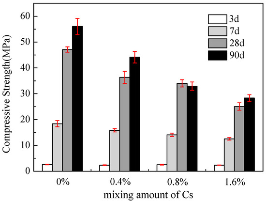 The compressive strengths of the MgO/SF-based mortar with different contents of Cs+ after 3, 7, 28 and 90 d is shown in Figure 2. The strength development of the M–S–H cement is markedly slow in the early stages, and the compressive strength is relatively low. The compressive strength of the samples without Cs+ significantly increases with an increase in age and exceeds 55 MPa until 90 d. This strength is attributed to the porous and low-strength Mg(OH)2 produced at the early hydration stage. As hydration progresses, the Mg(OH)2 gradually reacts with the SF and a denser M–S–H gel is formed over time.