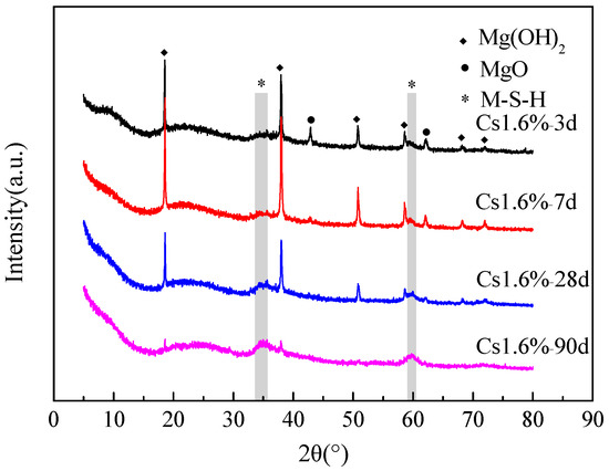 Figure 3 presents the X-ray diffraction data of the samples with 1.6 wt % Cs+ after 3, 7, 28 and 90 d. In the first 7 d, the reaction products are Mg(OH)2 and M–S–H gel (2θ at approximately 35° and 60°). After 7 d, the intensities of the MgO peaks at 43° and 62° decreases with time. The peaks of brucite also decrease with time, indicating that brucite continues to react with SF to form the M–S–H gel. At 90 d, most hydration products are M–S–H gels.