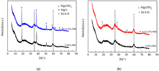 Figure 4 shows the XRD data of the samples with 1.6 wt % Cs+ and those without Cs+ after curing 28 and 90 d. The amount of Mg(OH)2 in the sample with Cs+ is more than that in the blank sample at 28 and 90 d, indicating that the addition of Cs+ reduces the rate of transformation from Mg(OH)2 to the M–S–H gel. In addition, no new substance is found.
