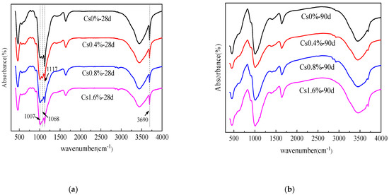 Fourier transform infrared spectra of the M–S–H cement-solidified body with 0 wt %, 0.4 wt %, 0.8 wt %, and 1.6 wt % Cs+ contents after (a) 28 and (b) 90 d.