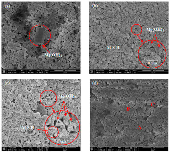 Figure 8 shows the microstructure of hydrated products with different contents of Cs+ at 28 d. When the content of Cs+ is relatively small, no significant change in the microstructure and compact degree is observed, and the reaction product is mainly M–S–H gel. With an increase in Cs+ content, the degree of compactness of the sample decreases significantly.