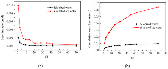 Table 4 and Figure 9 present the leaching rate and CLF of the solidified body with 0.8 wt % Cs+ in deionized water and simulated sea water. The results show that the leaching rate decreases with an increase in the leaching time. In the early stages of the immersion test, the leaching rate of the solidified body decreases significantly, and the rate of decline markedly slows down after 10 d; the leaching rate then tends to be flat. When the soaking cycle reaches 42 d, the leaching rate of Cs+ from the M–S–H cement-solidified body under the two leaching agents is only 5.34 × 10−5 cm/d and 4.69 × 10−4 cm/d, both of which are lower than the leaching rate limit of nuclide at 42 d, as stipulated in GB14569.1-2011 (Cs+ < 4 × 10−3 cm/d). The CLFs of the solidified body are 8.89 × 10−3 and 5.60 × 10−2 cm, both of which are considerably less than the required 42 d stipulated in GB14569.1-2011 (Cs+ < 0.26 cm), which are only 3.42% and 21.54% of the standard requirement.