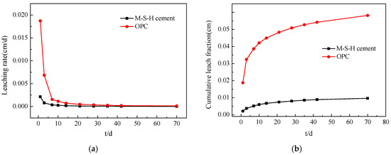 - The leaching rate and CLF of the M–S–H cement-solidified body are smaller than those of the OPC-solidified body at each leaching stage. The CLF of the OPC-solidified body is about 5–7 times higher than that of the M–S–H cement.