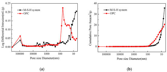 Pore size distribution (a) and accumulative pore area (b) of the M–S–H system-solidified body and ordinary Portland cement (OPC)-solidified body.